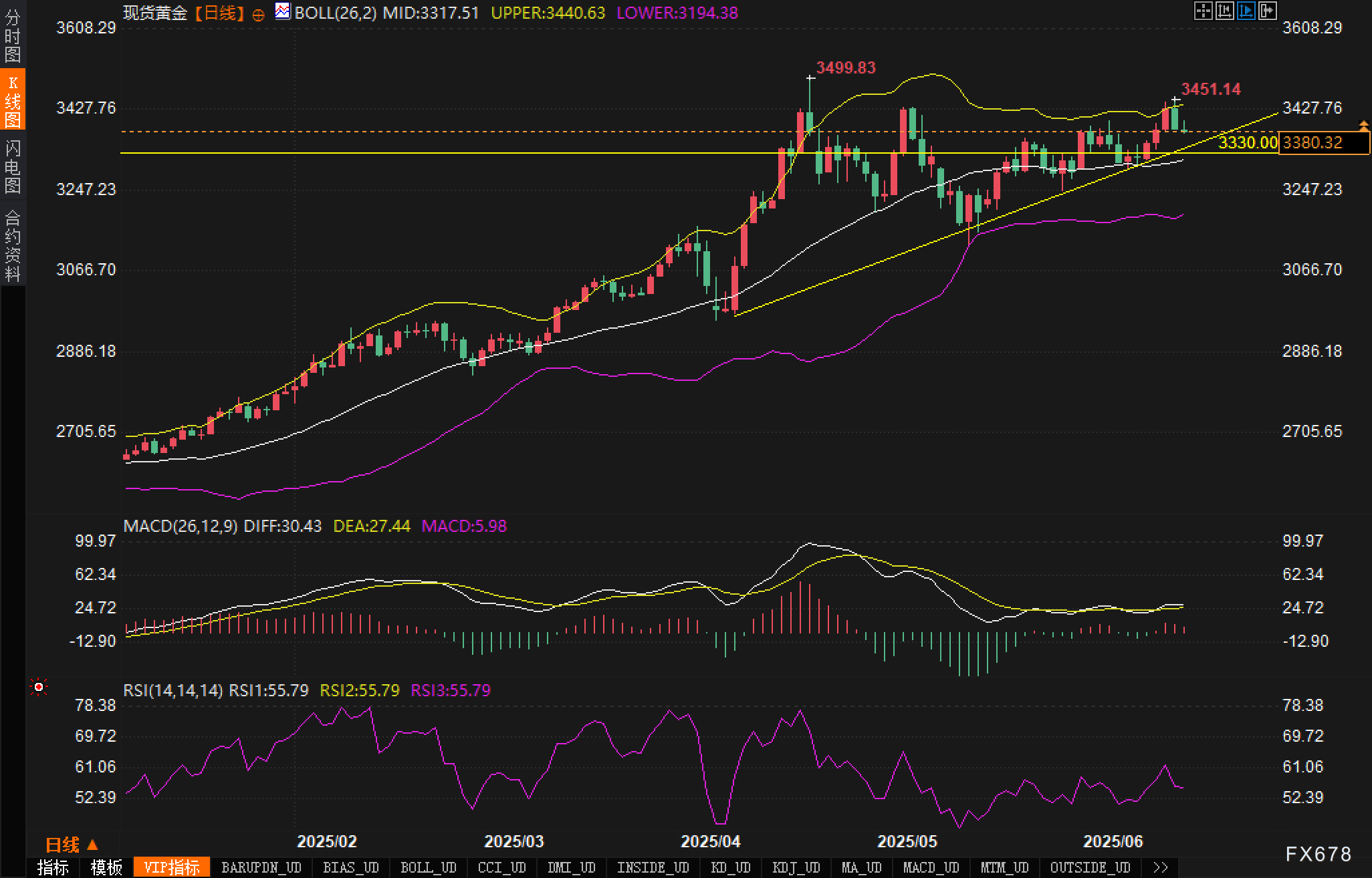 黄金日线K线图显示,当前走势处于典型的“上升楔形”形态中。价格今年以来沿一条上升趋势线稳步抬高,而上方则受到3450–3500区域的强阻压制,当前市场处于观望状态。