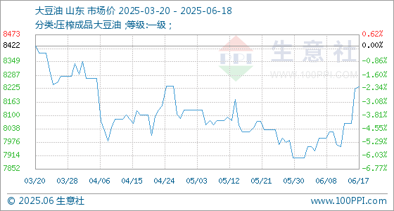 6月18日,生意社大豆油基准价为8234.00元/吨,与本月初(7904.00元/吨)相比,上涨了4.18%。