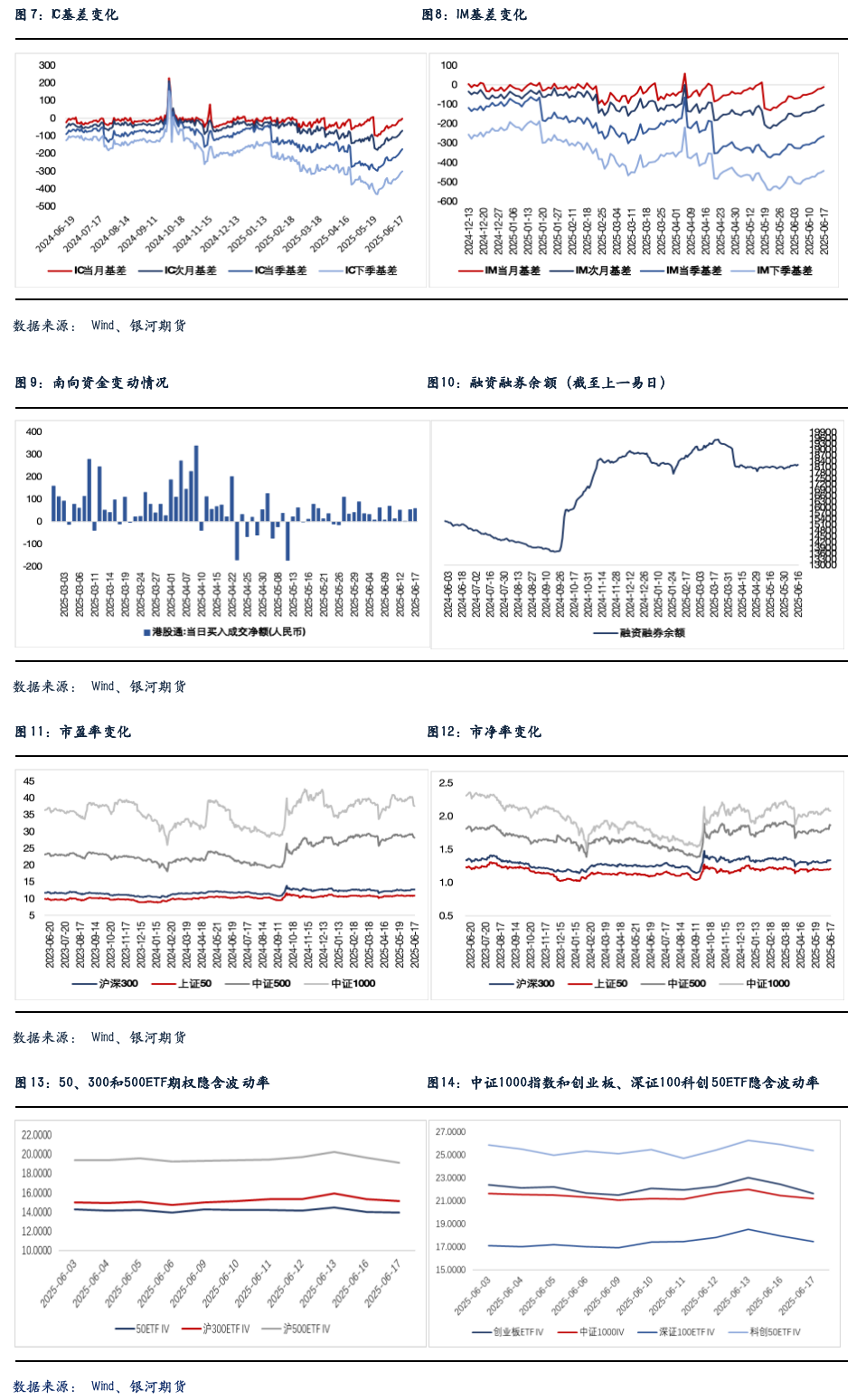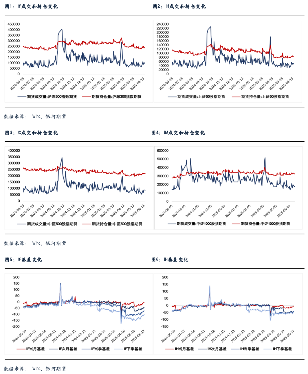 股指期货涨跌互现,至收盘,主力合约IH2506涨0.1%,IF2506跌0.01%,IC2506跌0.2%,IM2506涨0.02%。交割临近,当月合约贴水继续快速收敛,远月合约基差也有所上行。IM和IH成交分别增加4.1%和6%,IF和IC成交分别下降6.4%和0.1%;IM、IC和IF持仓分别增加1.7%、0.2%和0.5%;IH持仓下降0.5%。