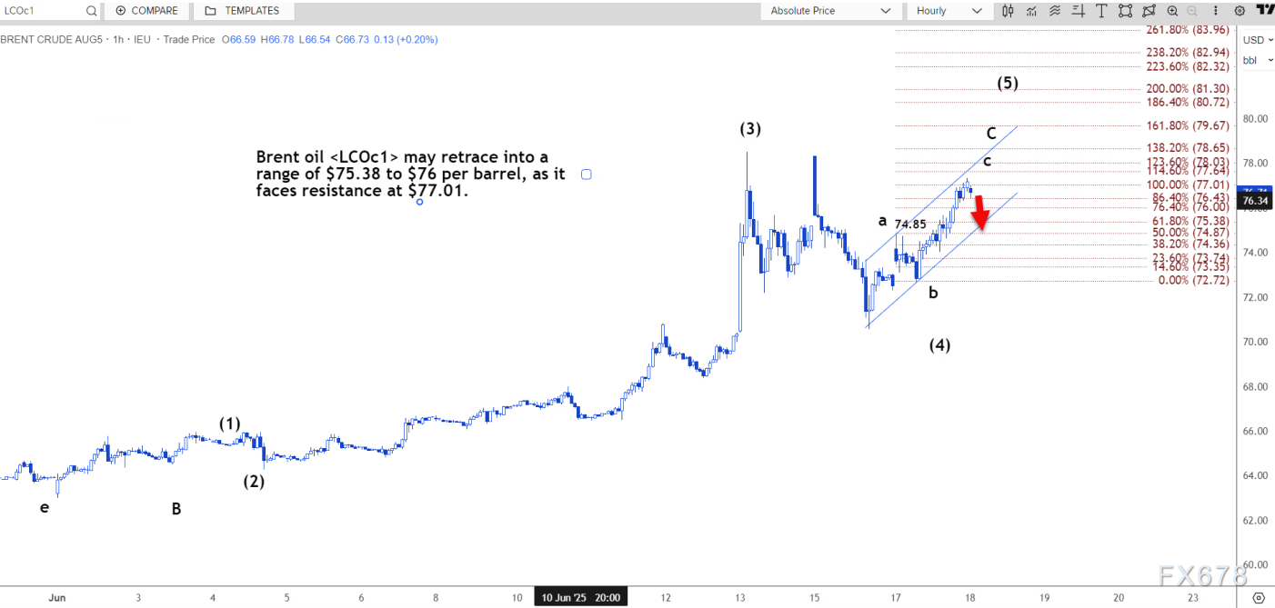路透技术分析师指出,布伦特原油可能回落至每桶 75.38 美元至 76 美元的区间,因为其面临 77.01 美元的阻力。