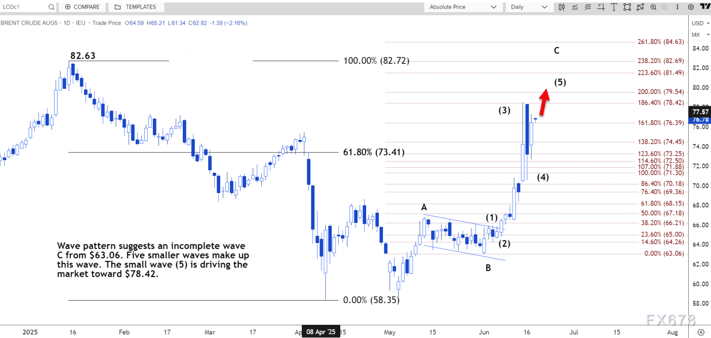 日线图上,波浪形态表明C浪自63.06美元开始,尚未完成。该浪由五个较小的波浪组成。小波浪(5)正推动市场向78.42美元迈进。