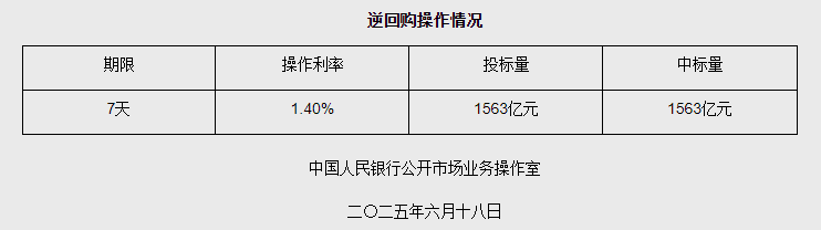 2025年6月18日,中国人民银行以固定利率、数量招标方式开展1563亿元逆回购操作,操作利率为1.40%,与此前持平。