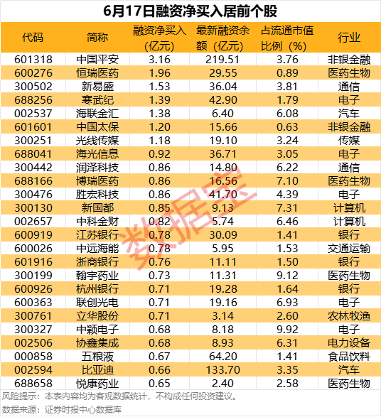 具体到个股,6月17日,共42只股获融资净买入额超5000万元。中国平安融资净买入额居首,当日净买入3.16亿元;其次是恒瑞医药、新易盛,融资净买入金额分别为1.96亿元、1.53亿元,融资净买入金额居前的还有寒武纪、海联金汇、中国太保等。