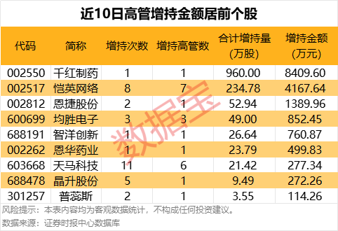从增持金额看,3股获增持超千万元,近10日增持金额最多的是千红制药,累计增持金额合计8409.60万元;其次是恺英网络、恩捷股份,增持金额分别为4167.64万元、1389.96万元。