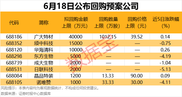 6月18日共有8家公司披露回购计划,均为科创板公司,多数为公司董事长、实际控制人或总经理等提议回购,按拟回购金额上限统计,广大特材、颀中科技、华海清科拟回购金额上限超亿元。