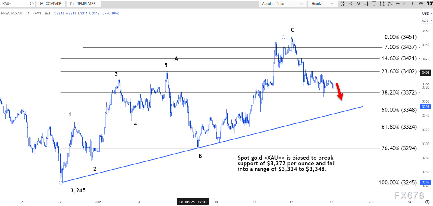 路透技术分析师指出,现货黄金倾向于突破每盎司 3372 美元的支撑位,并跌至 3324 美元至 3348 美元的区间。