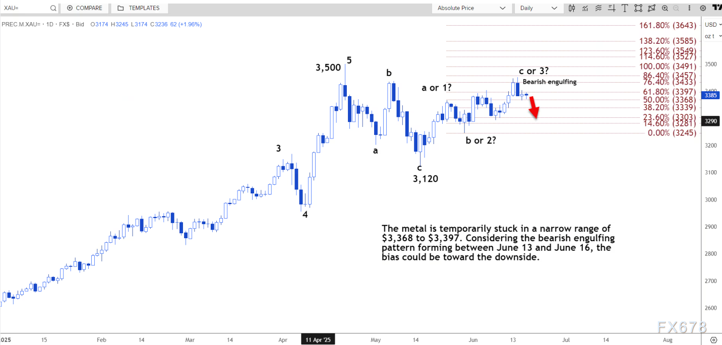 日线图显示,金价暂时处于3368美元至3397美元的窄幅区间内。考虑到6月13日至6月16日期间形成的看跌吞没形态,金价可能偏向下行。