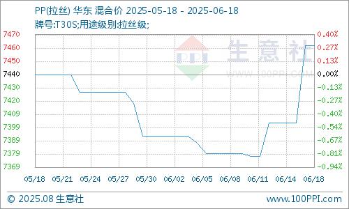 据生意社商品行情分析系统显示,6月中旬国内PP市场行情上涨,大部分牌号产品价格均有上调。截止6月18日,国内生产商、贸易商拉丝主流报盘价格在7461.67元/吨左右,较6月初价格水平涨跌幅+0.92%。