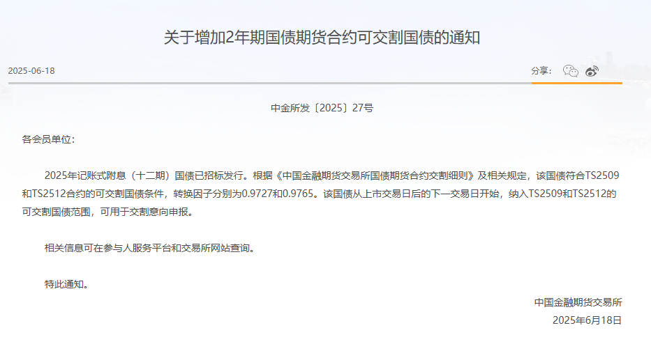 6月18日,中国金融期货交易所发布关于增加2年期国债期货合约可交割国债的通知:2025年记账式附息(十二期)国债已招标发行。根据《中国金融期货交易所国债期货合约交割细则》及相关规定,该国债符合TS2509和TS2512合约的可交割国债条件,转换因子分别为0.9727和0.9765。该国债从上市交易日后的下一交易日开始,纳入TS2509和TS2512的可交割国债范围,可用于交割意向申报。