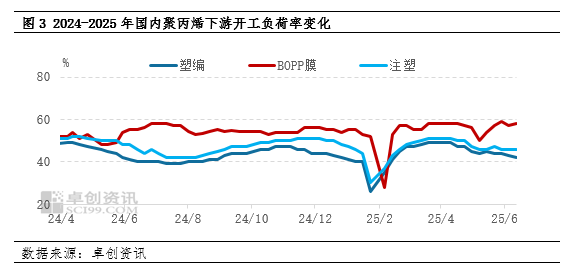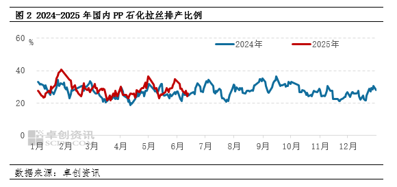 具体分析来看,华北区域PP拉丝价格跌速较缓与市场供应格局密不可分。二季度以来华北区域装置检修集中,天津联合二线、金能化学二期二线、中沙天津等多套装置停车检修且持续时间较长,同时有华北石化、山东某石化一线和五线以及宁夏宝丰一线等涉产拉丝装置停车短修,区域装置检修损失量处于高位。此外中煤榆林等西北煤化工装置停车检修对其调拨至华北市场的资源量也有所影响,叠加天津渤化和山东某石化三线拉丝排产比例有所下滑、中石化英力士(天津)短修,部分石化企业拉丝多供给出口,前端市场低价拉丝资源缩量,对华北区域PP拉丝价格形成支撑。