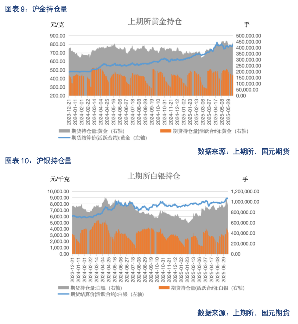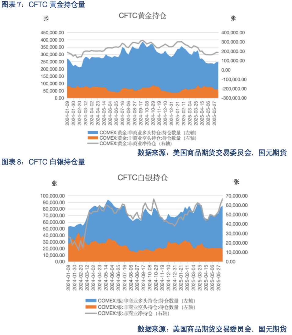 截至6月10日的周度统计周期中,黄金非商业多头持仓为245995张,较上周减少987张,非商业空头持仓为58514张,较上周减少563张,基金净持仓减少424张,多头离场,空头离场,多头持仓变化更大。截至6月10日的周度统计周期中,白银非商业多头持仓为85192张,较上周增加3,211张,非商业空头持仓为18542张,较上周减少2,669张,基金净持仓增加5,880张,多头进场,空头离场,多头持仓变化更大。