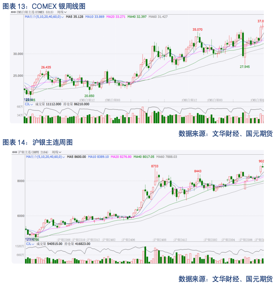 观察COMEX白银主连和沪银主连周线图,均线同样呈现多头排列,价格沿均线逐步攀升,不过白银K线波动幅度相对黄金更大,体现出其投机属性更强的特点。成交量上,阶段性的放量与缩量交替,反映多空博弈相对激烈,但整体上升过程中量能配合基本有效。从产业及宏观关联看,白银兼具金融与工业属性,在宏观环境复杂、工业需求预期及避险情绪交织下,技术面的多头结构未被破坏。尽管波动会加剧,但依托均线系统的支撑,以及宏观面潜在的利多因素,预计白银走势延续上升趋势,不过短期波动可能更为频繁,整体向上节奏有望保持。