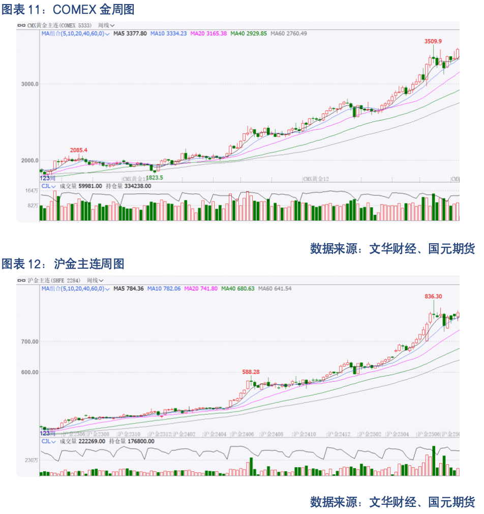 从COMEX黄金主连与沪金主连的周线图来看,均线系统呈现多头排列态势,短期均线持续在长期均线上方运行,表明黄金整体处于上升趋势中。尽管过程中存在K线的回调波动,但并未打破均线的多头支撑结构。成交量方面,未出现持续性大幅萎缩或放量下跌的极端情况,多头力量未完全撤离。结合宏观面,尽管有美联储政策、美元波动等因素扰动,但黄金的避险与抗通胀属性,叠加地缘等不确定性,支撑其趋势延续。技术形态与宏观逻辑共振,预计黄金走势仍将维持偏强的上升节奏,后续若宏观面无重大利空冲击,上涨趋势有望延续。