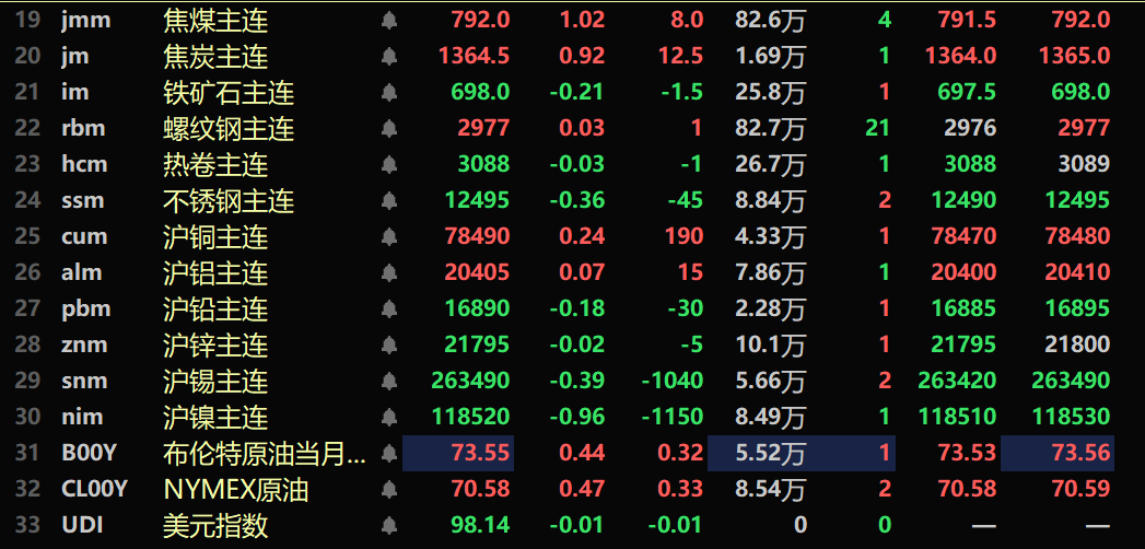 黑色系涨跌互现,铁矿跌0.21%,螺纹微涨,热卷微跌。不锈钢跌0.36%。双焦方面:焦煤涨1.02%,焦炭涨0.92%。