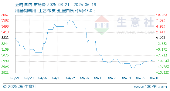 6月19日,生意社豆粕基准价为2998.00元/吨,与本月初(2956.00元/吨)相比,上涨了1.42%。