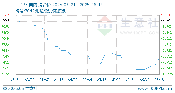 6月19日,生意社LLDPE基准价为7525.00元/吨,与本月初(7368.33元/吨)相比,上涨了2.13%。