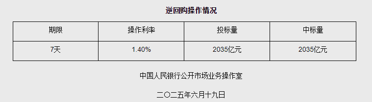 2025年6月19日,中国人民银行以固定利率、数量招标方式开展2035亿元逆回购操作,操作利率为1.40%,与此前持平。