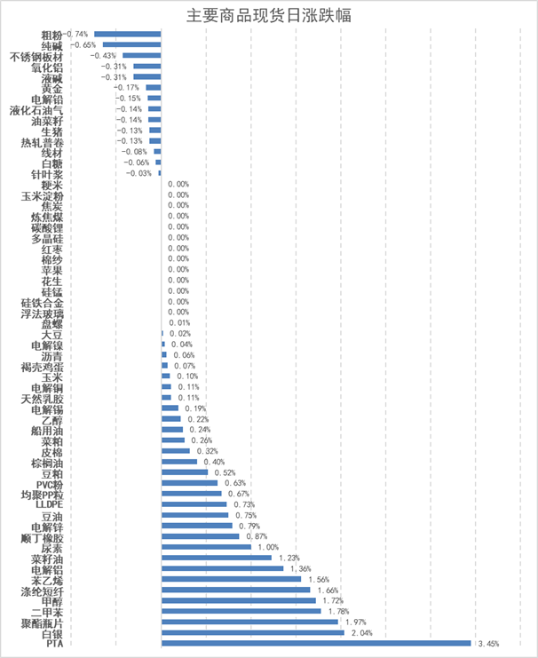 6月18日,卓创资讯监测商品现货市场31种上涨、14种下跌,13种企稳。市场消息叠加地缘问题对原油的支撑,PTA上下游相关商品价格显著上涨。金银比继续收窄,白银价格跌后再反弹。黑色继续下跌,无机化工延续弱势。(价格涨跌幅均以卓创资讯监测现货商品均价或主流市场价格计算)