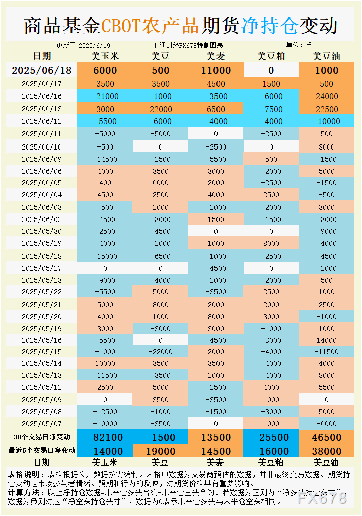 小麦市场周三表现最为强劲,7月合约飙升25-1/4美分,收于5.74-1/4美元/蒲式耳。持仓数据显示,6月18日基金增加小麦净多头11000手,最近5个交易日净多头增仓14500手,30个交易日累计增仓13500手,显示投机资金对小麦看涨情绪升温。基本面看,美国冬小麦收获因俄克拉荷马及堪萨斯湿润天气放缓,叠加俄乌局势不确定性和欧洲干旱担忧,触发短线空头回补。知名机构分析师Terry Linn指出,基金在小麦上的庞大净空头头寸使其易受短线反弹驱动,而阿尔及利亚本周采购超50万吨小麦的招标进一步提振出口预期。