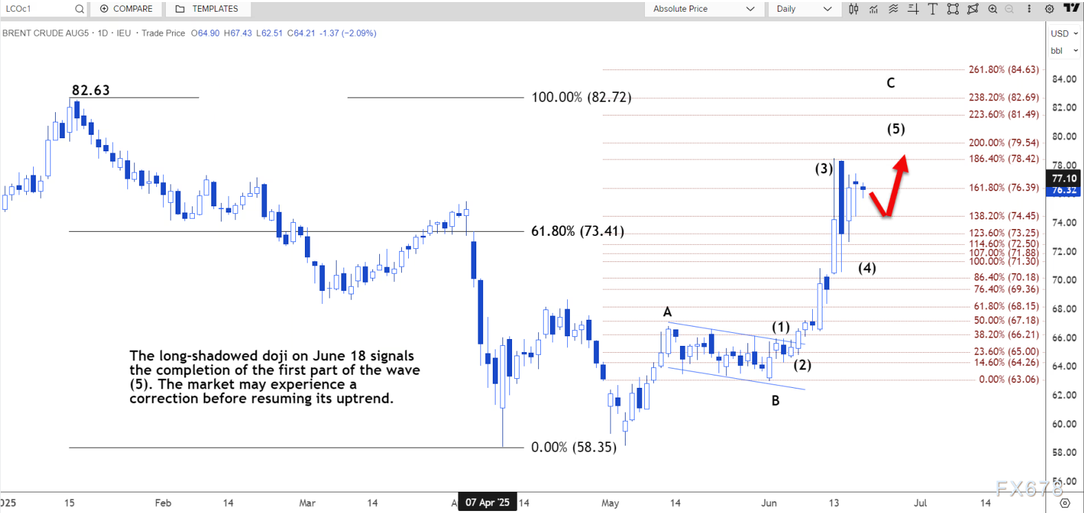 6月18日出现的长影线十字星预示着本浪第一部分(5)的完成。市场可能会经历回调,然后恢复上涨趋势。