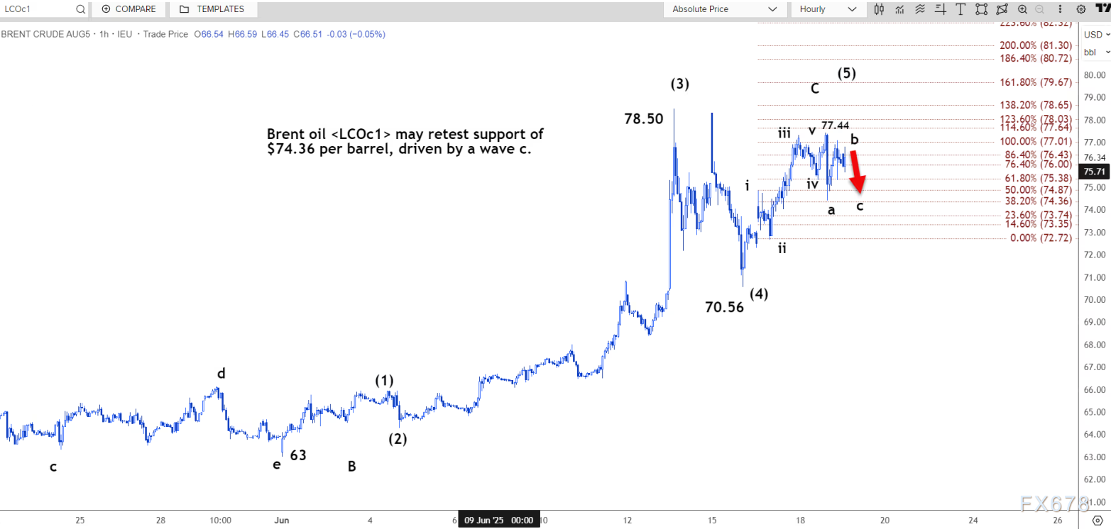 路透技术分析师指出,受 c 浪推动,布伦特原油可能重新测试每桶 74.36 美元的支撑位。