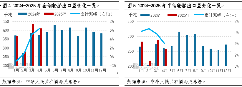 2025年上半年轮胎出口市场保持韧性,对开工形成正向反馈带动。一方面,考虑后期关税增长,轮胎企业提前出口,海外客户积极备货;另一方面海外轮胎企业关停增多,更多市场需求转移至从中国进口,而中国轮胎价格便宜、性价比高,在全球市场份额不断增长。2025年1-4月全钢轮胎累计出口1489.69千吨,同比增长6.45%;半钢轮胎累计出口1046.15千吨,同比增长4.05%。