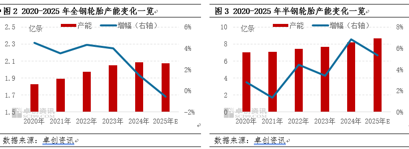 近几年轮胎行业产能仍然保持稳中增长趋势,提升了轮胎产量释放的基数,支撑天然橡胶消费量稳步增长。其中,全钢轮胎行业虽然进入到供过于求的运行阶段,但是基于头部企业全网式布控、供应链合作、租赁盘活等新合作推动下,行业产能并未止步不前,相反在行业新的头部力量带动下产能仍然维持谨慎增速推进,2025年全钢轮胎新增产能预计260万条,产能转移涉及370万条,最终国内产能2025年预期或减少110万条,处于高位整理。半钢轮胎年度总产能增长势头较好,2025年半钢轮胎产能仍将维持稳步上升态势,年内半钢新增产能预计4650万条左右,同时部分厂家退出约260万条,最终2025年产能预计增长4390万条,涨幅5.34个百分点。