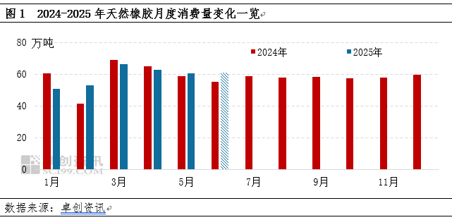因此,2025年上半年轮胎市场在近两年新产能投放以及出口市场保持韧性支撑下,产量保持增长趋势。据卓创资讯监测数据显示,2025年1-6月预计中国全钢轮胎累计产量同比涨幅3.59%;预计半钢轮胎累计产量同比涨幅2.43%。轮胎产量的增长,对于天然橡胶下游刚性需求亦有积极传导。2025年下半年,天然橡胶需求市场将在主要下游轮胎市场新产能投放、汽车行业稳步发展以及外部压力上升倒逼国内政策加码预期的支撑下仍将保持相对高位;但同时下半年外围宏观风险犹存,外贸环境复杂多变,企业订单承压,或整体压缩天然橡胶总需求增量,从而导致需求端来看缺乏对天然橡胶价格的有利支撑。