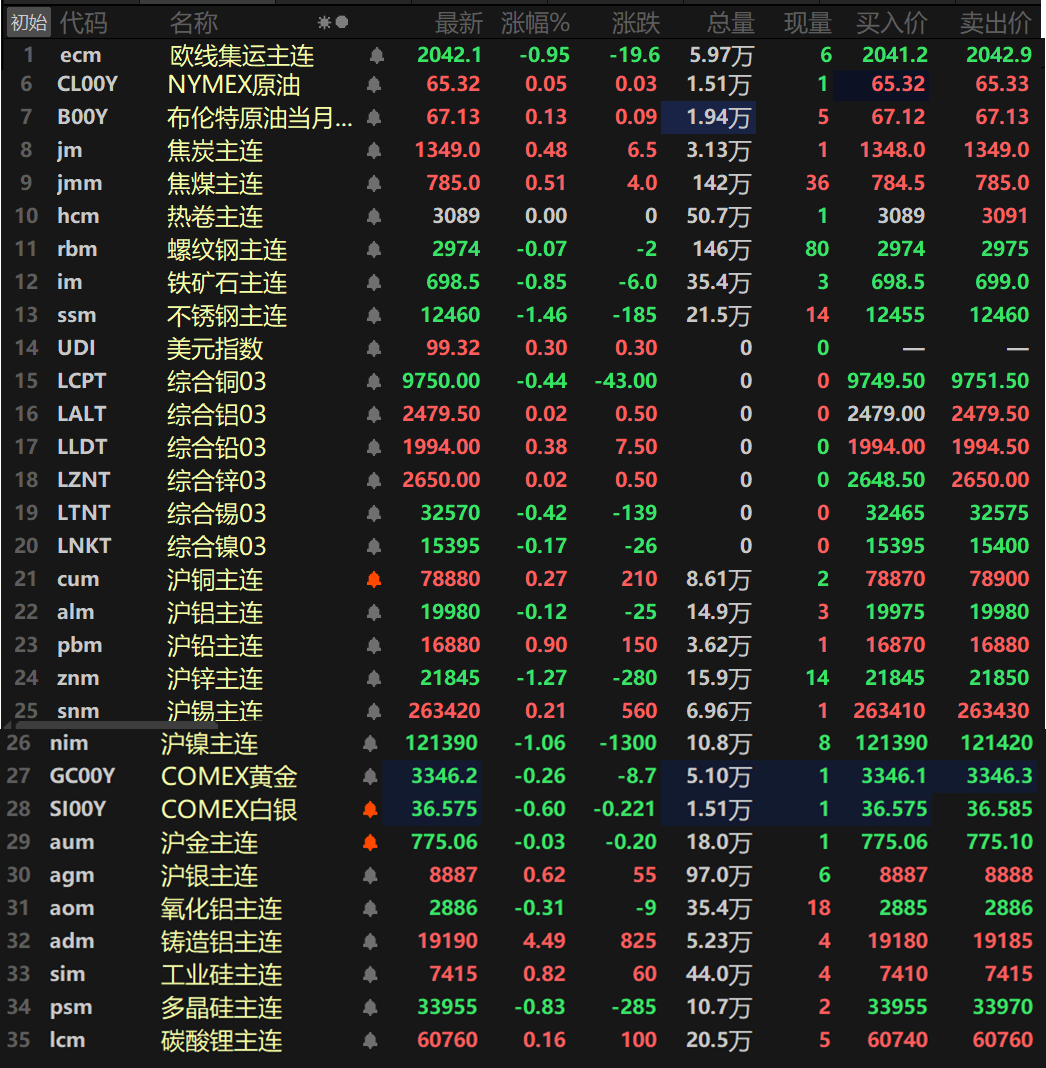 此外,碳酸锂主连涨0.16%,多晶硅主连跌0.83%,工业硅主连涨0.82%。欧线集运主连跌0.95%。