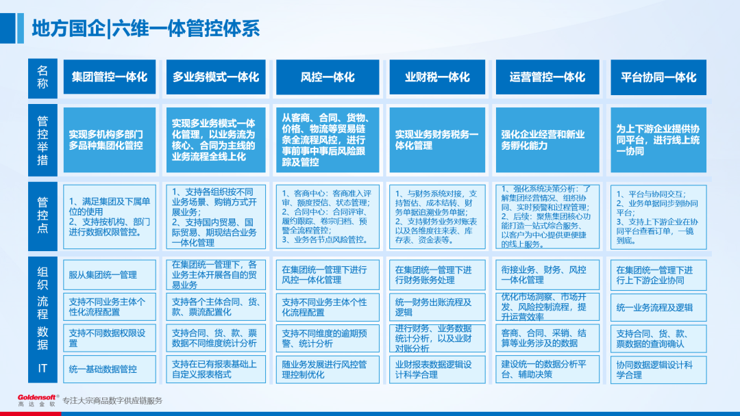 风控一体化。从客商、合同、货物、价格、物流等贸易链条进行全流程风控,实现事前、事中、事后的风险跟踪及管控。