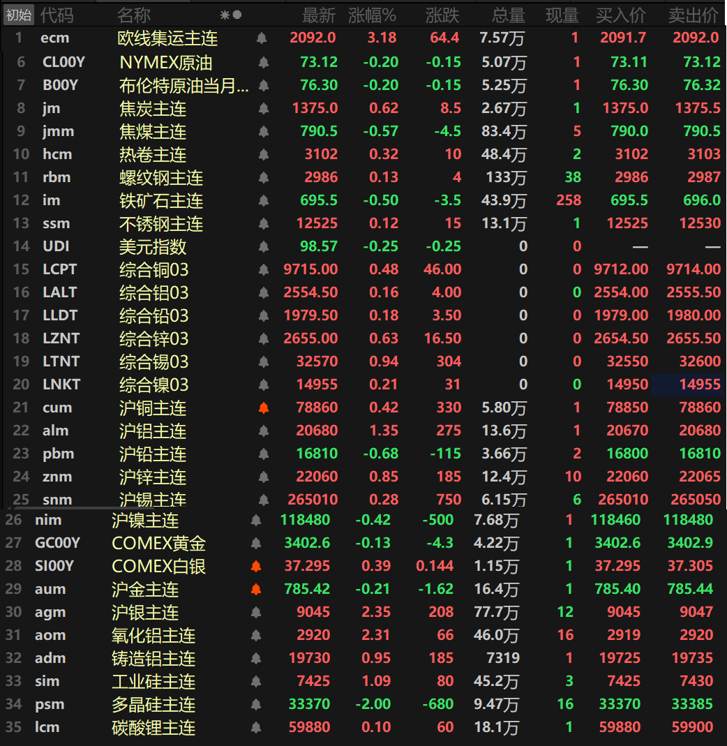 此外,碳酸锂涨0.1%,多晶硅跌2%,工业硅涨1.09%。欧线集运主连涨3.18%。