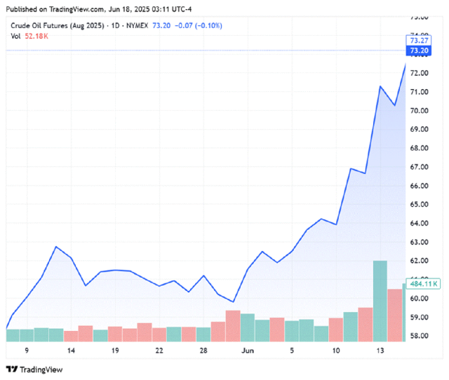 近期,中东地缘政治危机升级,以色列和伊朗烽烟再起,市场担忧中东原油供应遭到破坏,国际原油价格一度大幅上涨,其中NYMEX WTI原油8月合约价格一度升至75.5美元/桶,目前徘徊在73美元/桶(下图),这对于供应过剩的原油市场带来利好。