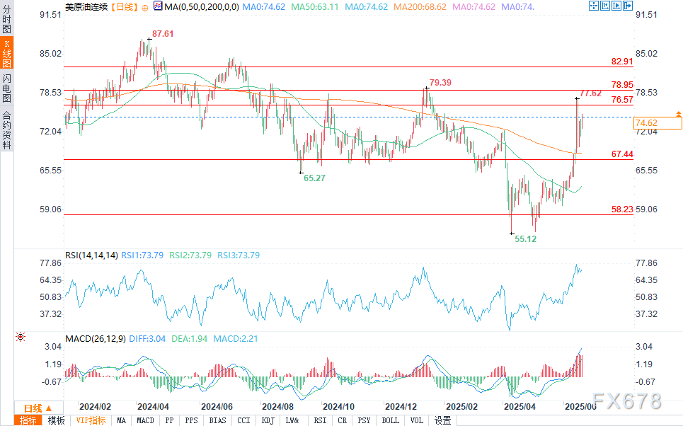 WTI原油目前轻松高于50日和200日移动平均线(分别为61.40美元和65.05美元),表明看涨动能持续。需关注的关键阻力位为76.57美元和78.95美元,支撑位在67.44美元附近。若冲突风险和整体经济信号保持稳定,回调可能被视为买入机会。