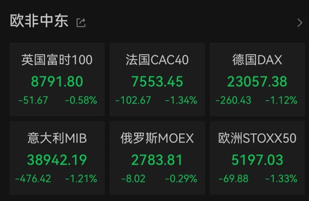 欧洲股市全面下跌。数据显示,截至收盘,英国富时100指数跌0.58%,法国CAC40指数跌1.34%,德国DAX指数跌1.12%,意大利MIB指数跌1.21%,欧洲STOXX50指数跌1.33%。