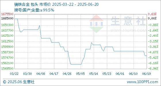 6月20日,生意社镝铁合金基准价为1580000.00元/吨,与本月初(1590000.00元/吨)相比,下降了0.63%。