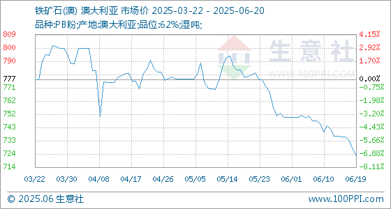 6月20日,生意社铁矿石(澳)基准价为722.56元/吨,与本月初(750.33元/吨)相比,下降了3.7%。