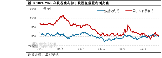 油品方向最重要的两个装置MTBE以及烷基化装置利润同样表现不佳,烷基化装置理论利润长期亏损,而异丁烷脱氢装置从2024年的513元/吨的年均利润,降至2025年上半年预估值为-183元/吨,装置利润盈转亏。