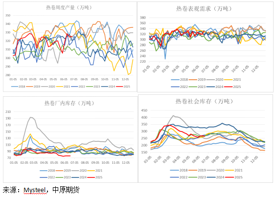 相对而言,目前热卷仍处于供需双旺的格局,近一周需求韧性突显,周度供需结构呈现产需双增,产量微增0.8万吨至325.45万吨,同比较2024年回升1%;表观需求回升10.81万吨至330.69万吨,同比高出2014年4%。总库存由增转降,环比下降5.24万吨,其中社库下降5.23万吨,同比低于2024年18%;厂库下降0.01万吨,同比较2024年下降14%。整体来看,热卷社库处于历史中位水平,厂库历史低位,累库矛盾相对有限。