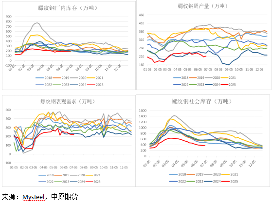 6月以来,黑色系探底回升,但整体反弹力度有限,连续两周呈现震荡。一方面,海外宏观事件扰动加大,关税反复、地缘局势发酵,令市场心态较为谨慎。另一方面,库存仍处于下降阶段,矛盾并未突显,且铁水日产转增,同比高位,负反馈压力有限,原料端支撑加强。短时钢价走势纠结,多空博弈持续。但随着淡季深入,需求转弱预期将进一步增强,钢价后续仍有压力。