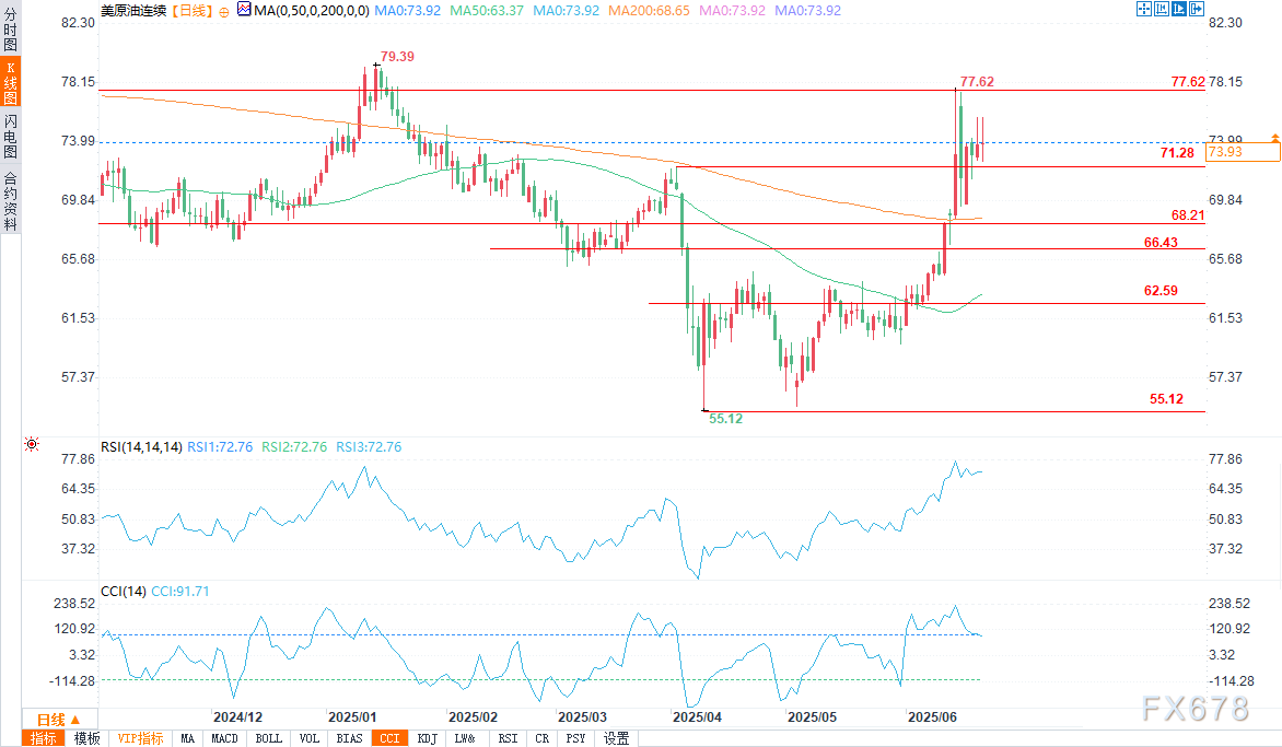 WTI原油日线图显示,从5月下旬到6月中旬上涨了30%,价格在接近76美元的阻力位下方停滞。商品通道指数(CCI)自5月下旬以来一直处于超买状态,目前正接近100下方的潜在卖出信号。波动性在6月14日达到峰值,此后有所回落,这表明如果中东紧张局势没有进一步升级,油价可能会出现回调。