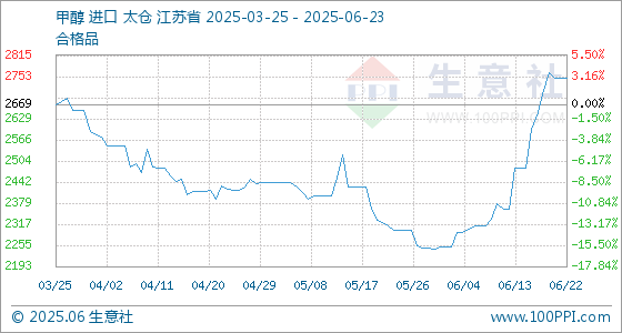 6月23日,生意社甲醇基准价为2747.50元/吨,与本月初(2250.00元/吨)相比,上涨了22.11%。