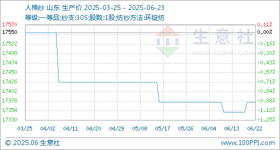 6月23日,生意社人棉纱基准价为17375.00元/吨,与本月初持平。