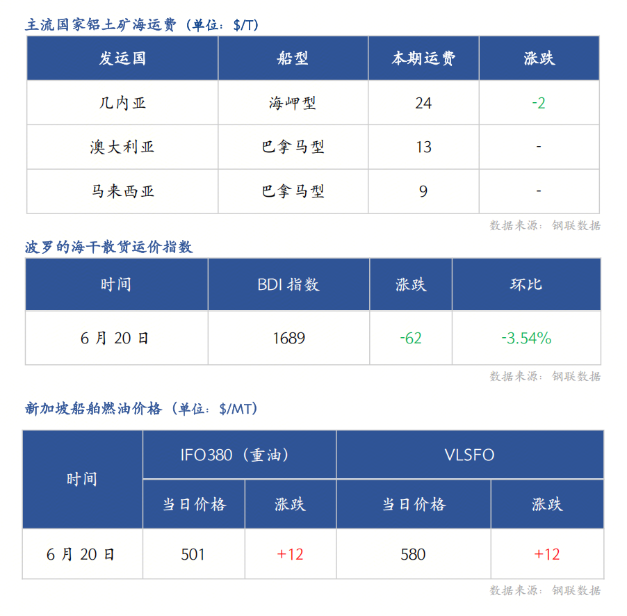 6月23日澳大利亚和土耳其一水软铝矿价格有所,市场有新的成交流出。几内亚地区海运费和波罗的海运价指数有所回落,船舶燃油价格依旧小幅上涨。