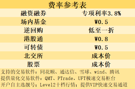 开立账户给您佣金成本价,专项两融账户可以享受3.8%的年利率,场内基金万0.5,我司有Ptrade和QMT量化软件!支持同花顺/通达信登陆!软件支持同花顺!欢迎详询