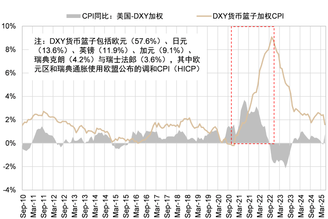 第三,与美国通胀背离。2021年起美国通胀显著攀升,CPI同比增速在2022年一度突破9%,但美元却并未贬值,反而持续走强。美元指数(DXY指数)的权重集中于欧元、日元、英镑等发达经济体货币,这些国家疫后同样面临通胀上行。如果以DXY篮子中各货币占比为权重构建加权通胀指标,可以发现美国与其他主要发达经济体的通胀水平差距并不大。若将视角拓展至新兴市场,美国近年通胀水平明显高于多数新兴经济体,但美元仍未出现贬值。