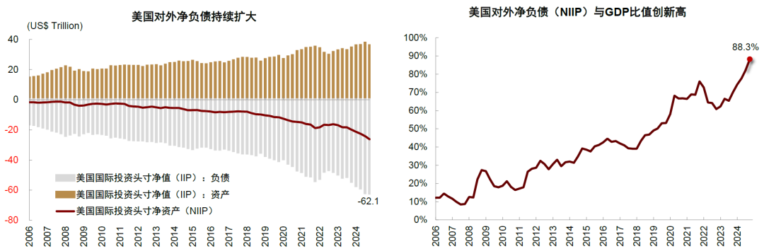 从政策面看,美国有很强的动机寻求美元贬值。这不仅是因为政策制定者相信美元应该贬值,更是美国资产负债结构的变化所致。过去20年间,美国的资产和负债规模都经历了快速扩张,其中负债增速尤为显著。从2006年到2024年四季度,美国对外总负债从16万亿美元膨胀到62万亿美元,对外总资产从14万亿美元扩张到36万亿美元。两者相减得到的美国对外净负债从不到2万亿美元快速累积到26万亿美元,当前占美国GDP比重高达88.3%。美国用本币负债,投资海外风险资产。如果美元贬值,其负债不会上升,但海外资产因美元贬值而扩张,这相当于全世界向美国进行转移支付。给定这样一个外币资产、本币负债的特殊结构,简单估算下来,美元每年仅需贬值4.4%即可弥补美国的经常账户赤字(与GDP之比为3.9%)。因此,美国不会主动放弃美元的国际储备货币地位,但考虑到美国资产负债结构的持续恶化,美国具有强烈的动机让美元贬值。