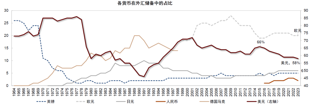 需要注意的是,即便美元处于下行周期,也不意味着美元会丧失储备货币地位或者拱手让出储备货币地位。对于美元储备货币,存在很多误解,特别是关于特里芬难题。无论是“特里芬难题1.0”还是“特里芬难题2.0”,本质上都是储备货币发行国无法在提供全球流动性的同时确保币值稳定。如果由此认为,国际储备货币发行国必须通过经常账户赤字来提供全球流动性,则是一种误读。成为储备货币发行国,不一定要求经常账户赤字,通过私营部门对外投资实现货币输出即可为全球提供国际货币。历史事实也证明了这一点。美国1944年超越英国成为储备货币发行国,但在1944年到1975年的30年间,美国经常账户大部分时间是盈余的。储备货币地位确实有代价,但好处更多。比如消除汇率错配风险,可以用本币发债、可以收取铸币税、可以通过汇率贬值改善资产负债表等,这些好处远远大于成本。美国不会轻易放弃美元储备货币地位,但会利用贬值来获取更多收益。