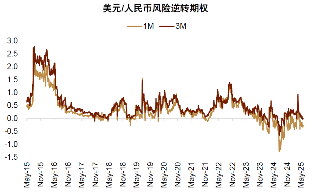 衍生品市场微观数据,亦显示美元看空情绪。美元非商业期货净多头头寸已降至过去3年10%分位数以下,显示市场看空美元的情绪较浓,且尚没有明显反弹趋势。美元指数1月与3月期的期权风险逆转指标也已跌至负值,相比2022年俄乌冲突爆发时的高点明显回落。类似的趋势在欧元/美元风险逆转期权和美元/人民币风险逆转期权中也有体现。2025年2月以来,欧元/美元3月期风险逆转期权从-1最高升至+1左右,虽然近期有所回落但仍处高位,反映衍生品市场预期欧元仍有升值空间。与此同时,人民币升值预期也在增强,美元/人民币1月期风险逆转期权进入负值区间,3月期降至0附近。2015年“8·11汇改”前后,市场曾对人民币贬值的预期强烈,1月期和3月期美元/人民币风险逆转期权分别飙升至+2.7和+2.8的高位。到2023年,二者明显回落,但仍围绕+0.3和+0.4的中枢运行,市场对人民币仍存一定贬值担忧。最新的数据则显示,市场已经开始转向押注人民币升值。