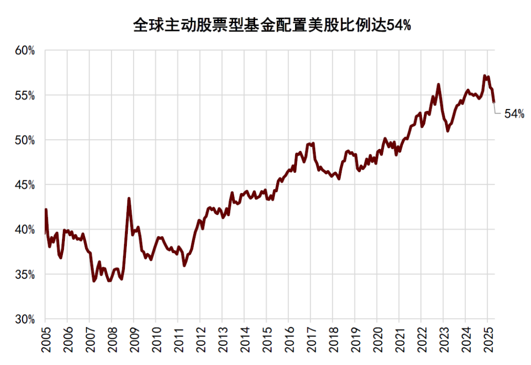 在实体与金融两个正反馈机制的作用下,美元估值可能已经偏离基本面。从价格层面看,IMF美元实际有效汇率较其长期均衡水平高估约14%。从数量层面看,全球主动股票型基金和主动债券型基金对美国的配置比例分别高达54%和45%,均处于历史高位。