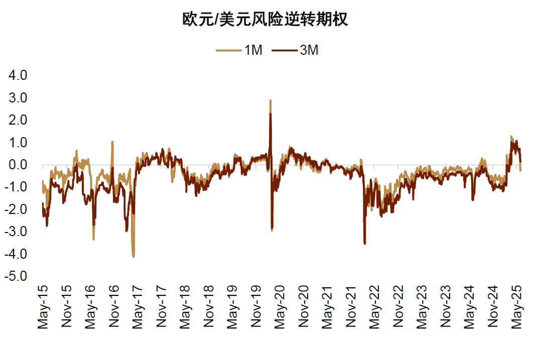 图表:欧元/美元风险逆转期权近期有所回落,不过3M及以上期限的风险逆转期权仍处于近年来较高水平